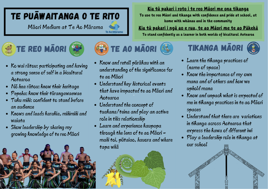 Kia tū pakari ngā tauira i ngā ao e rua, te ao Māori me te ao Pākeha. To stand confidently as a learner in both worlds of bicultural Aotearoa.