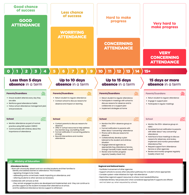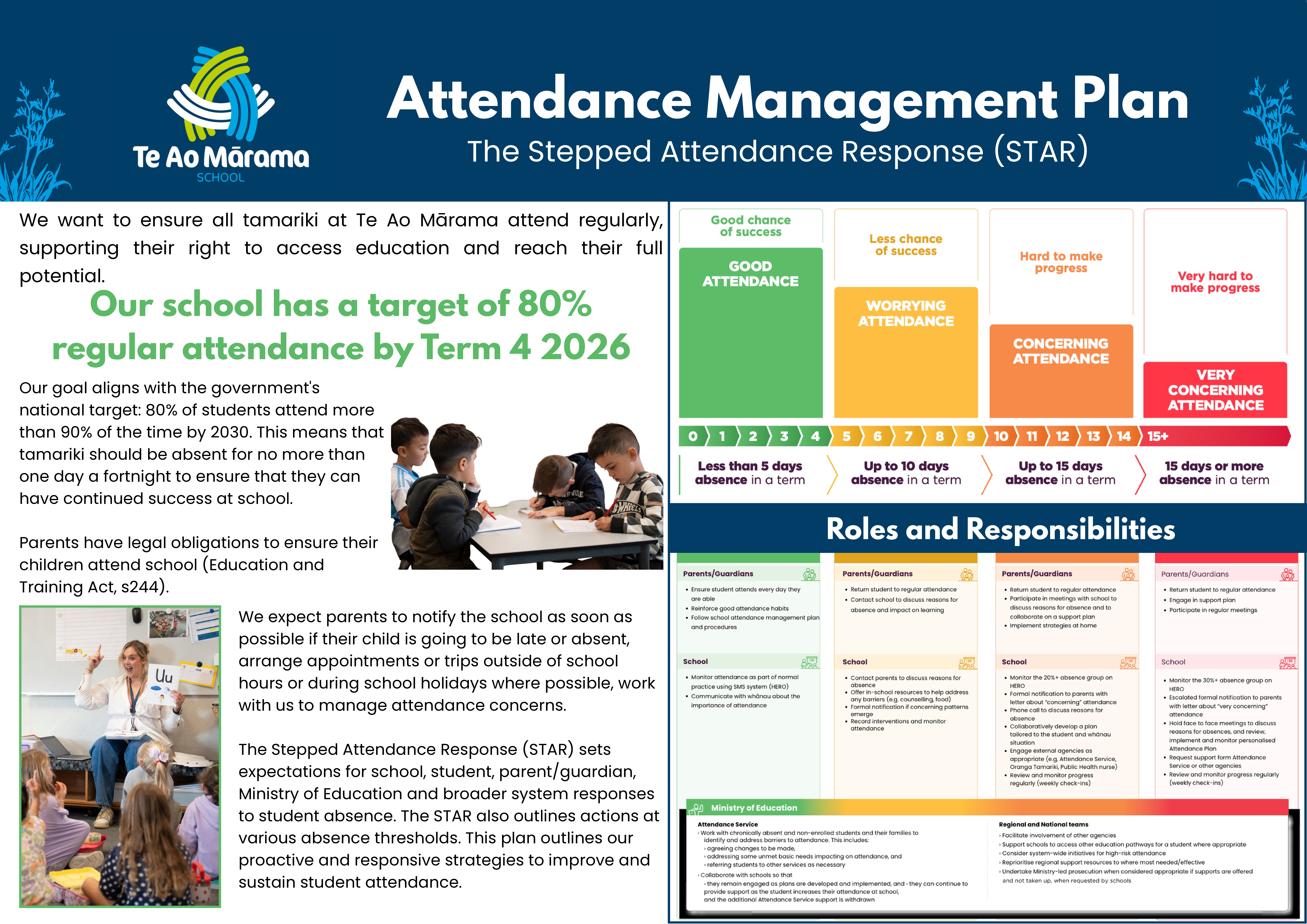The Stepped Attendance Response (STAR) sets expectations for school, student, parent/guardian, Ministry of Education and broader system responses to student absence. The STAR also outlines actions at various absence thresholds. This plan outlines our proactive and responsive strategies to improve and sustain student attendance.